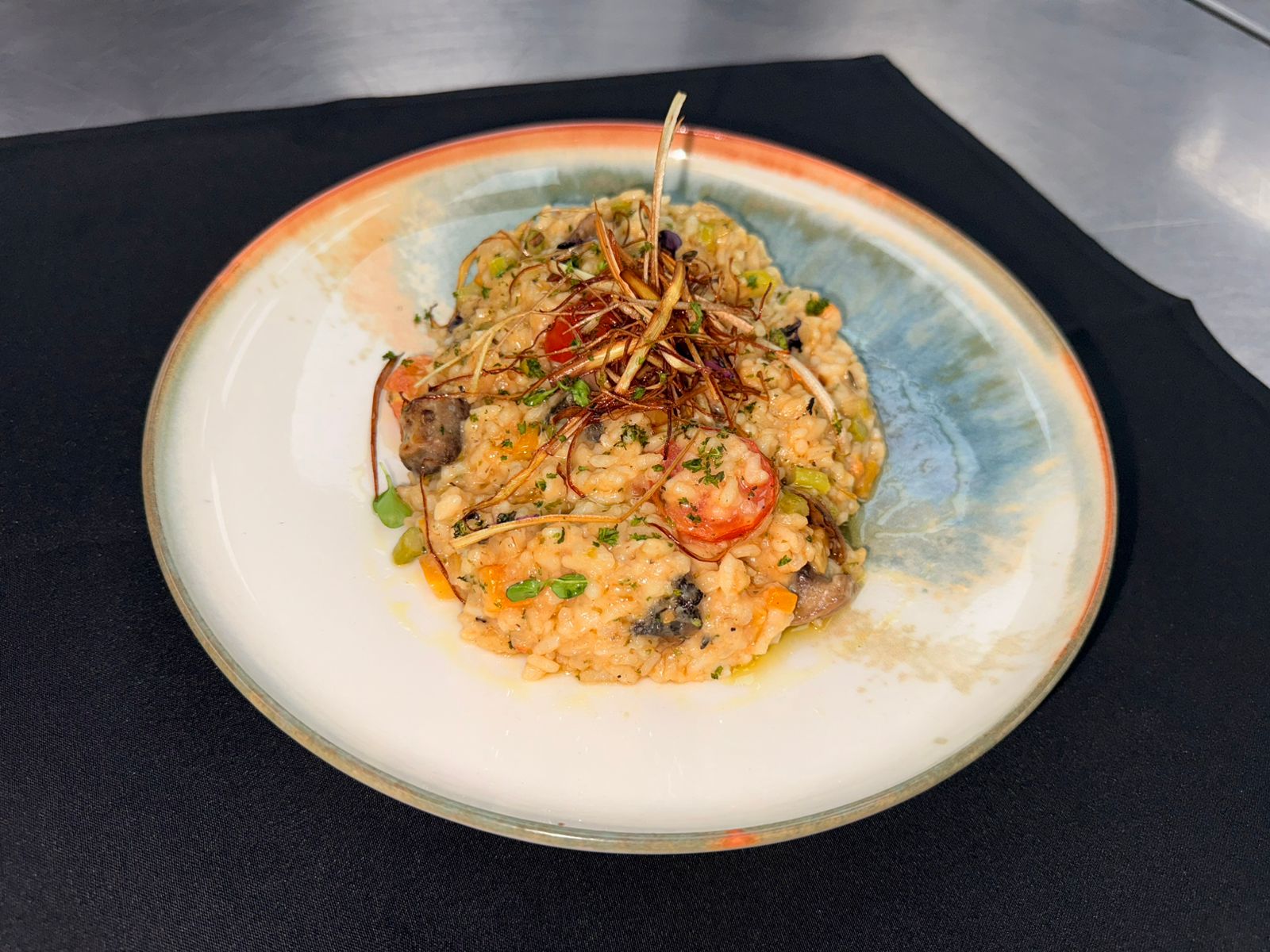 - A comforting risotto crafted with Arborio rice, gently simmered in fragrant vegetable broth and folded with seasonal garden vegetables. Thoughtfully prepared as a light yet satisfying, shareable experience, this risotto...