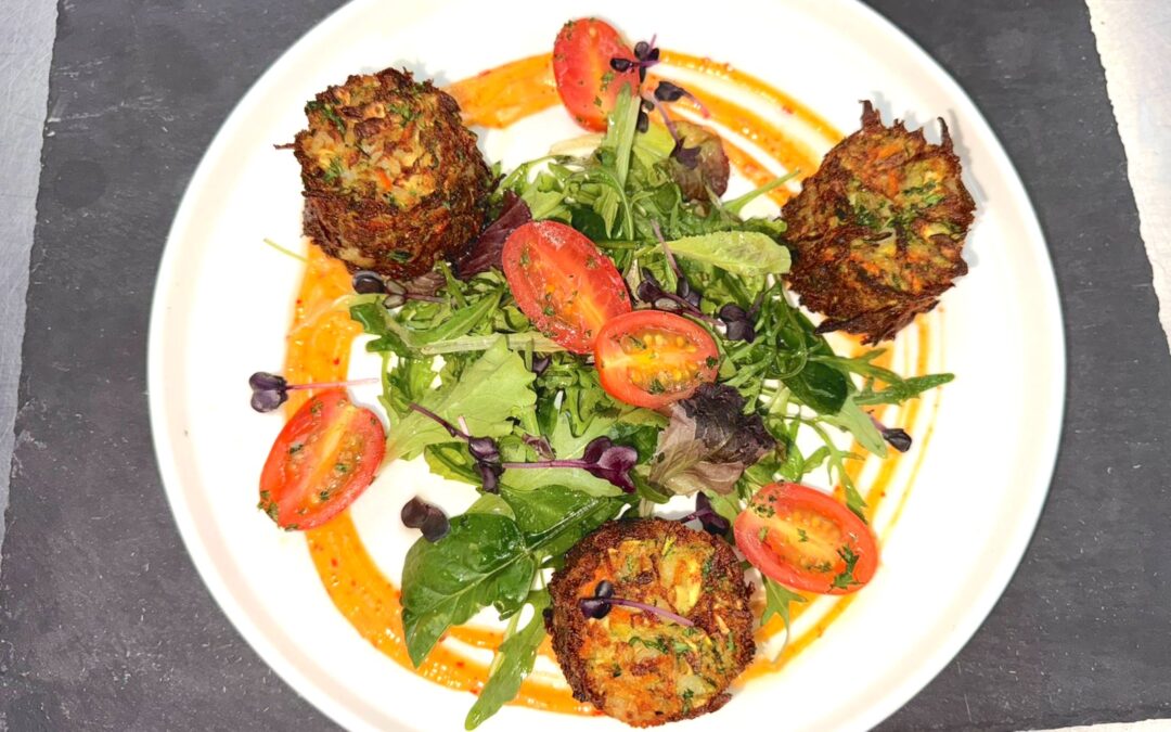 A vibrant, island-inspired appetizer featuring crisp zucchini, carrot, and potato fritters. Served with fresh arugula, cherry tomatoes, and edible flowers, this dish is lightly dressed…