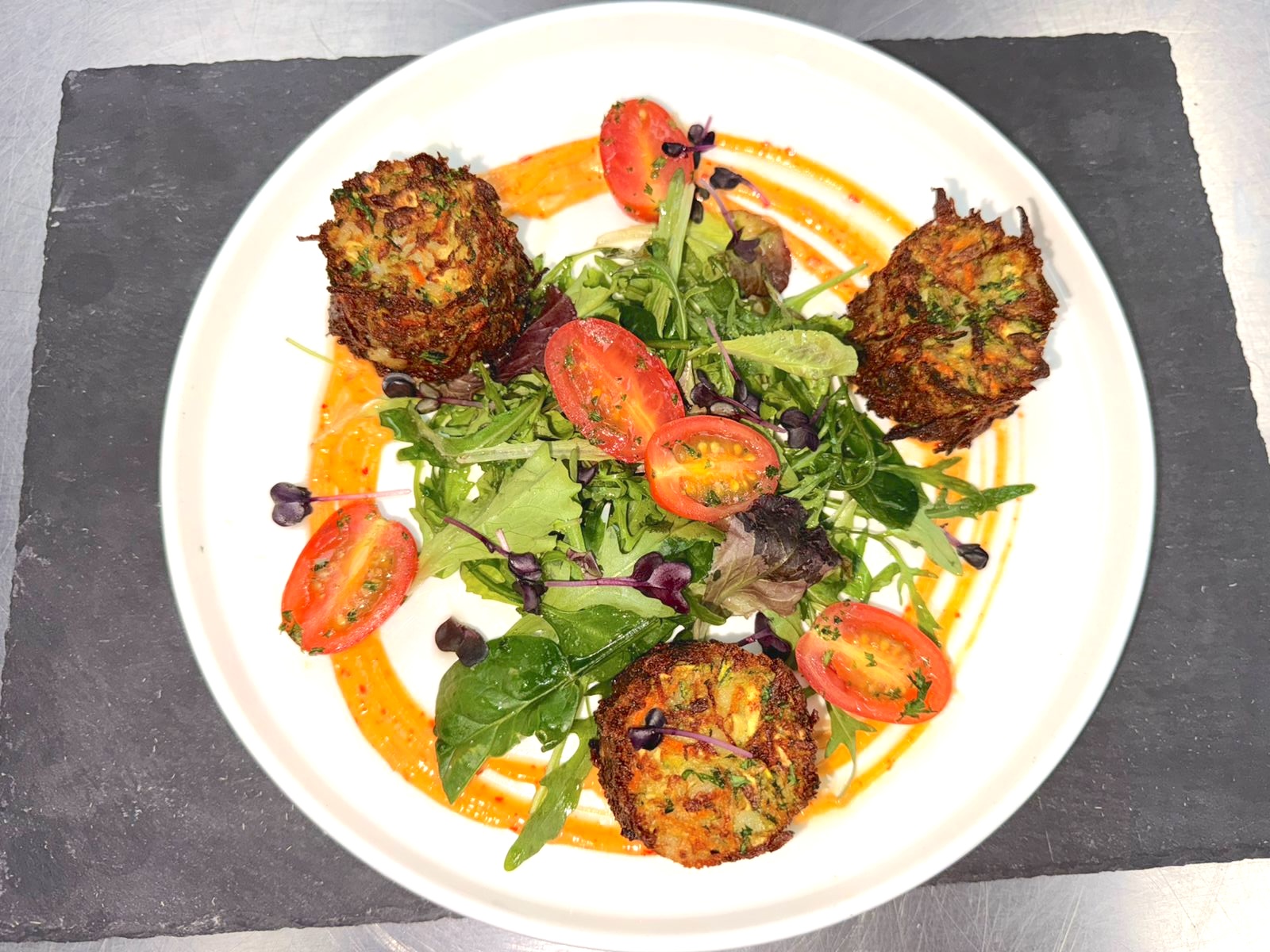 - A vibrant, island-inspired appetizer featuring crisp zucchini, carrot, and potato fritters. Served with fresh arugula, cherry tomatoes, and edible flowers, this dish is lightly dressed in a sweet-and-spicy vinaigrette and...